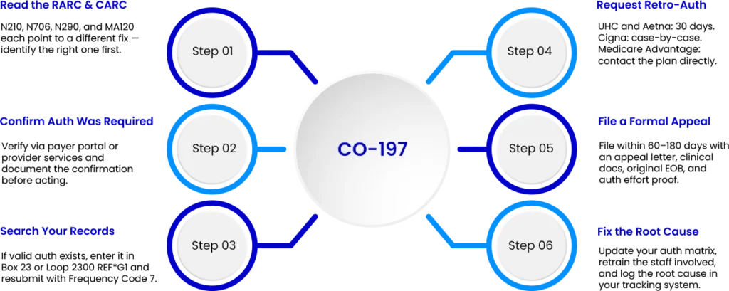 Pro-Tip: Build an “authorization scrub” into your pre-submission workflow. Before any claim is submitted, run it against your authorization log. Unmatched claims get held and flagged — not submitted. This single step eliminates the most common cause of CO-197: valid authorizations that never make it onto the claim form.
